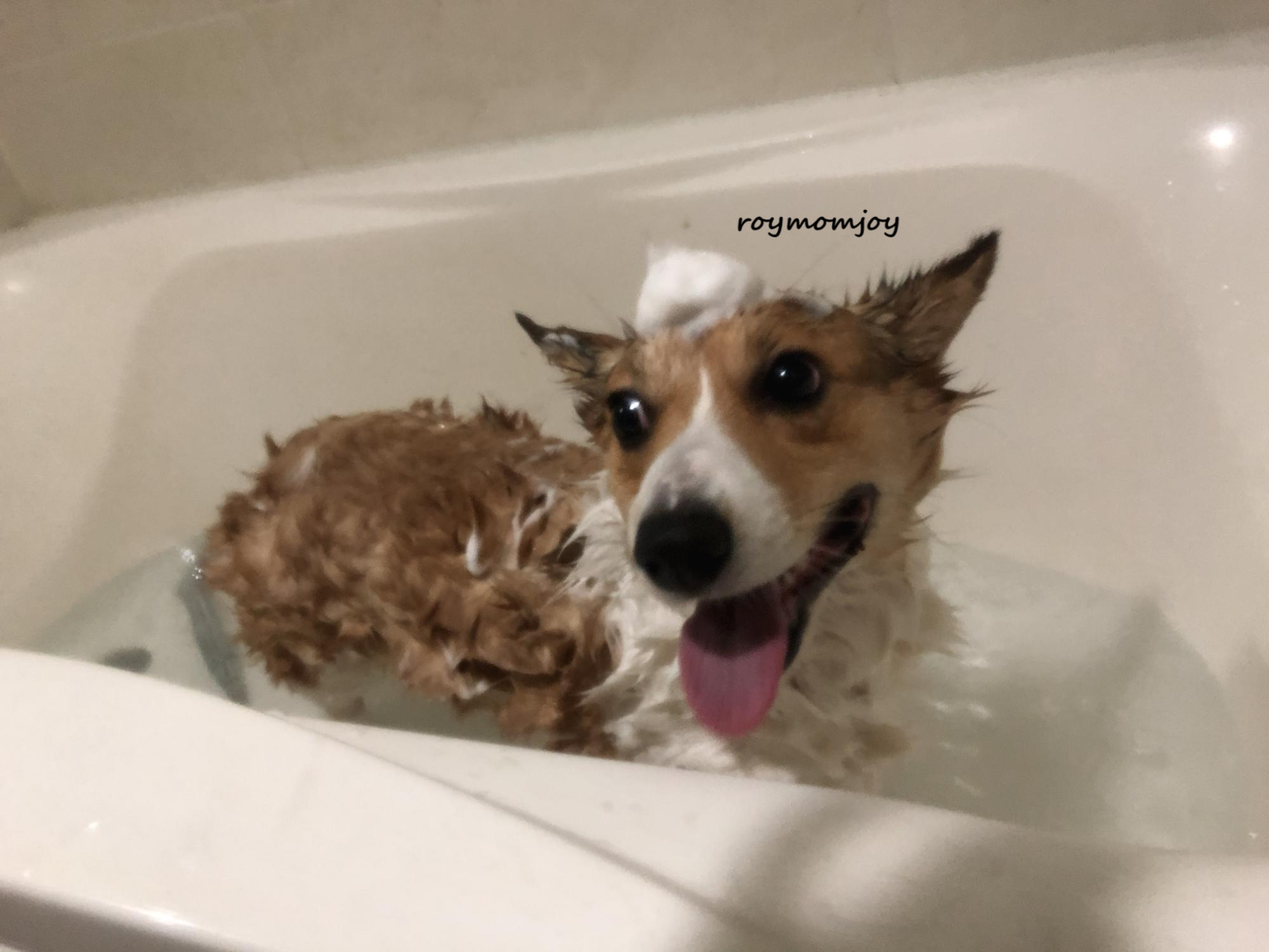 이제 아르르 크리미 샴푸로 로이를 목욕시켜 봤어요.