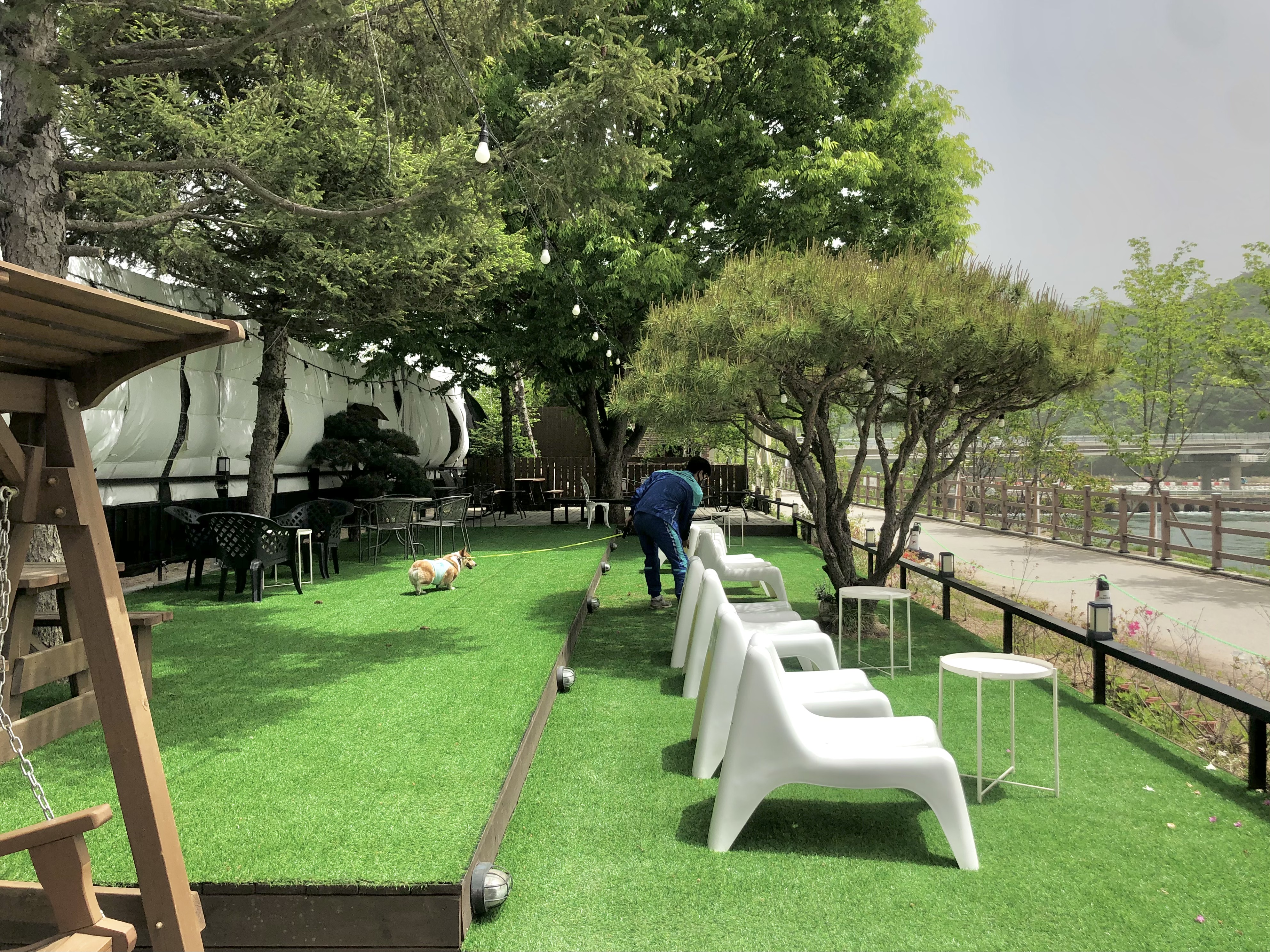 야외에는 인조잔디가 깔려있고 나무 그늘도 있어서 바깥 바람 쐬기 좋았어요. 바로 앞의 소양강을 보면서 힐링타임~