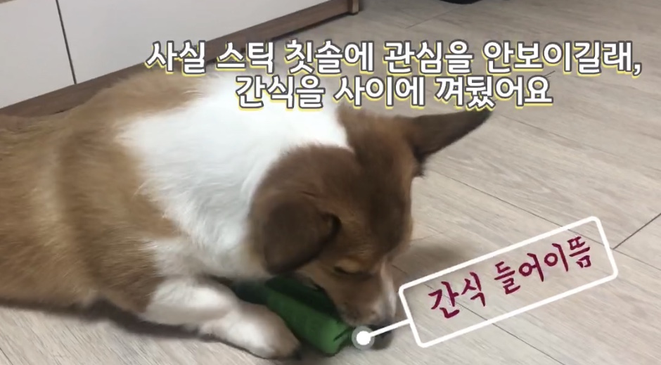 강아지가 너무 장난감에 흥미를 안보이는 것 같으면 스틱 가운데의 구멍에 간식이나 강아지 덴탈껌 등을 끼워주시면 좋아요.