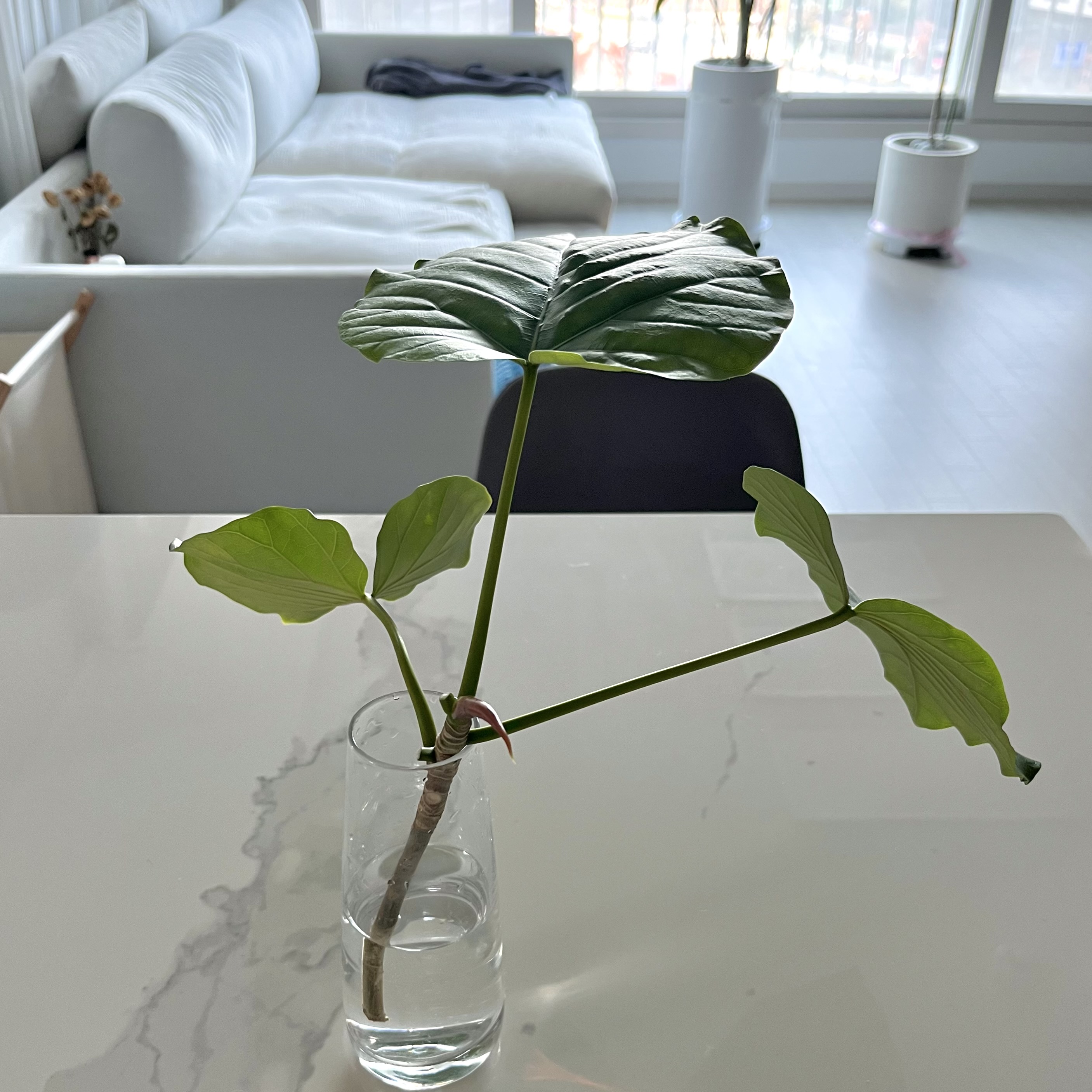 그래서 수형 정리도 해줄 겸, 이파리가 달려있는 가지를 길게 꺾어서 물꽂이를 시작해봤다.
