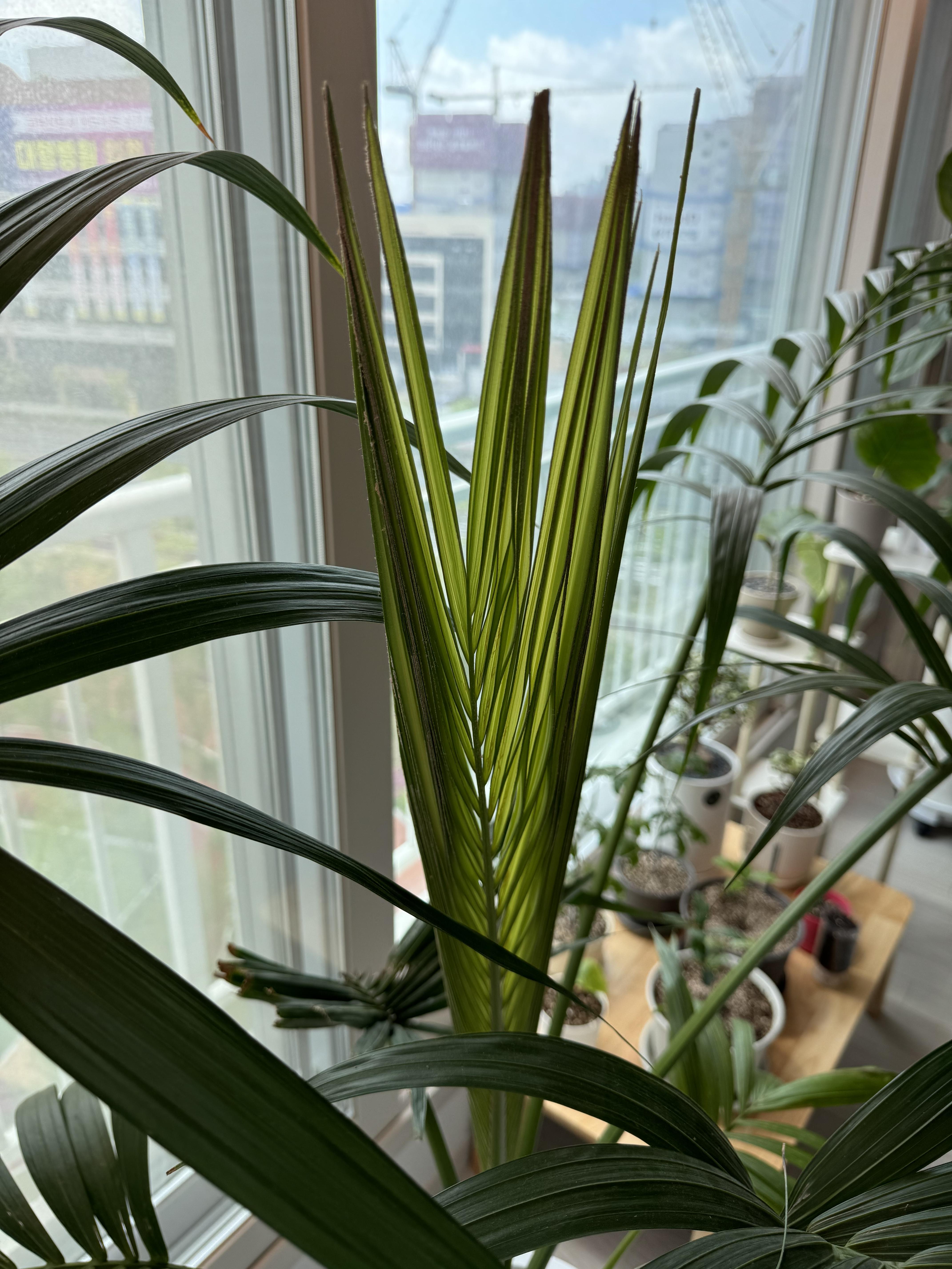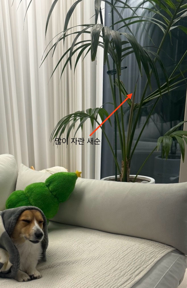 나는 요즘 물꽂이 하고 뿌리를 내리는 움베르타에 푹 빠져 있어서 야자나무를 거의 신경 못쓰고 있었는데, 어느 날 문득 보니 새순이 무럭무럭 자라서 입을 쩍 벌리고 있었다.