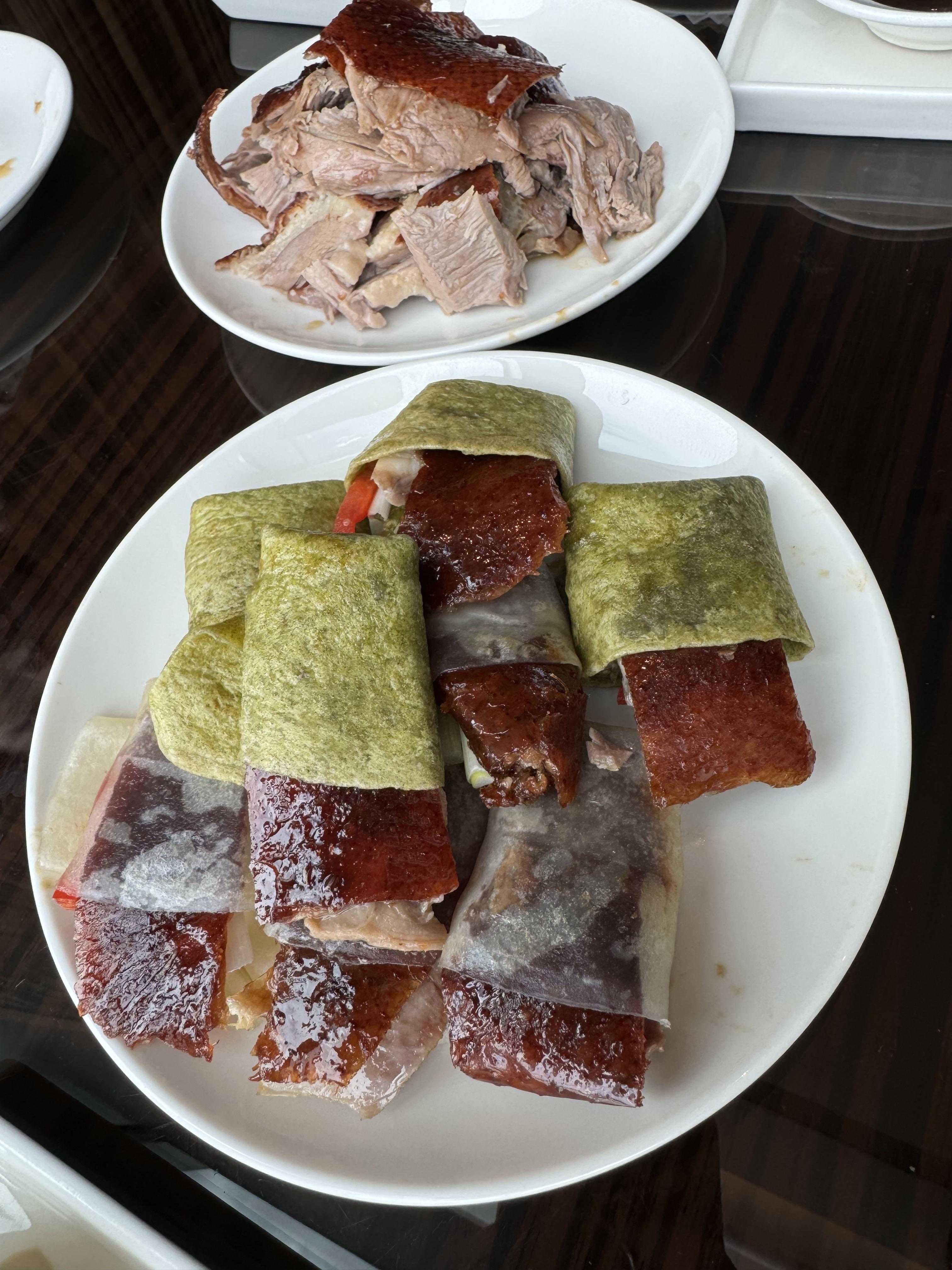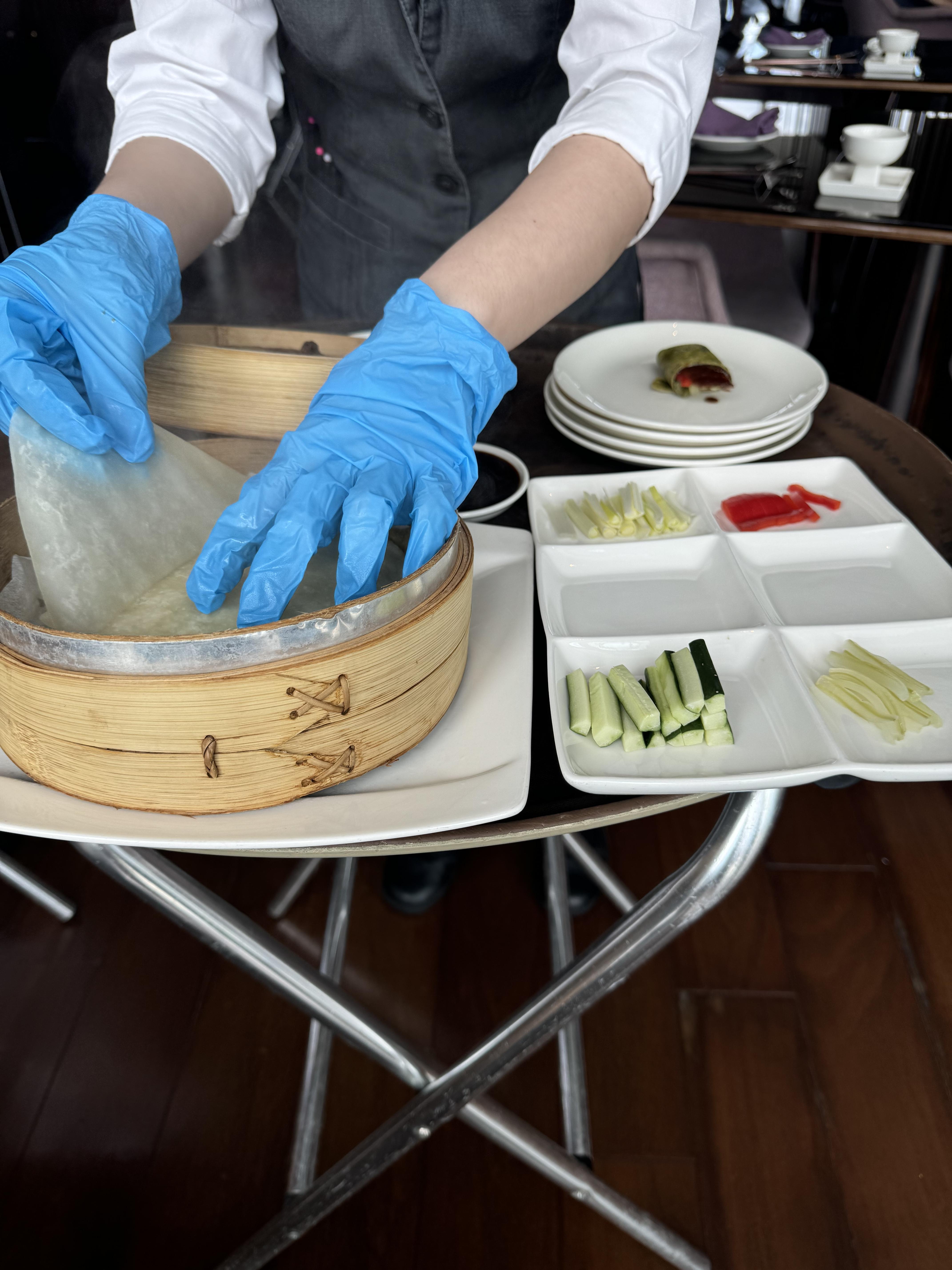 셰프님이 베이징덕 반마리를 우리 테이블 쪽으로 가져오셔서는 바삭한 껍질 부위를 먹기 좋게 잘라 주시고, 옆에 보조셰프(?)님이 쌈을 만들어 주신다. 친구랑 나는 오이를 안 먹기 때문에 오이를 가리키며 빼달라고 적극적으로 말했다.