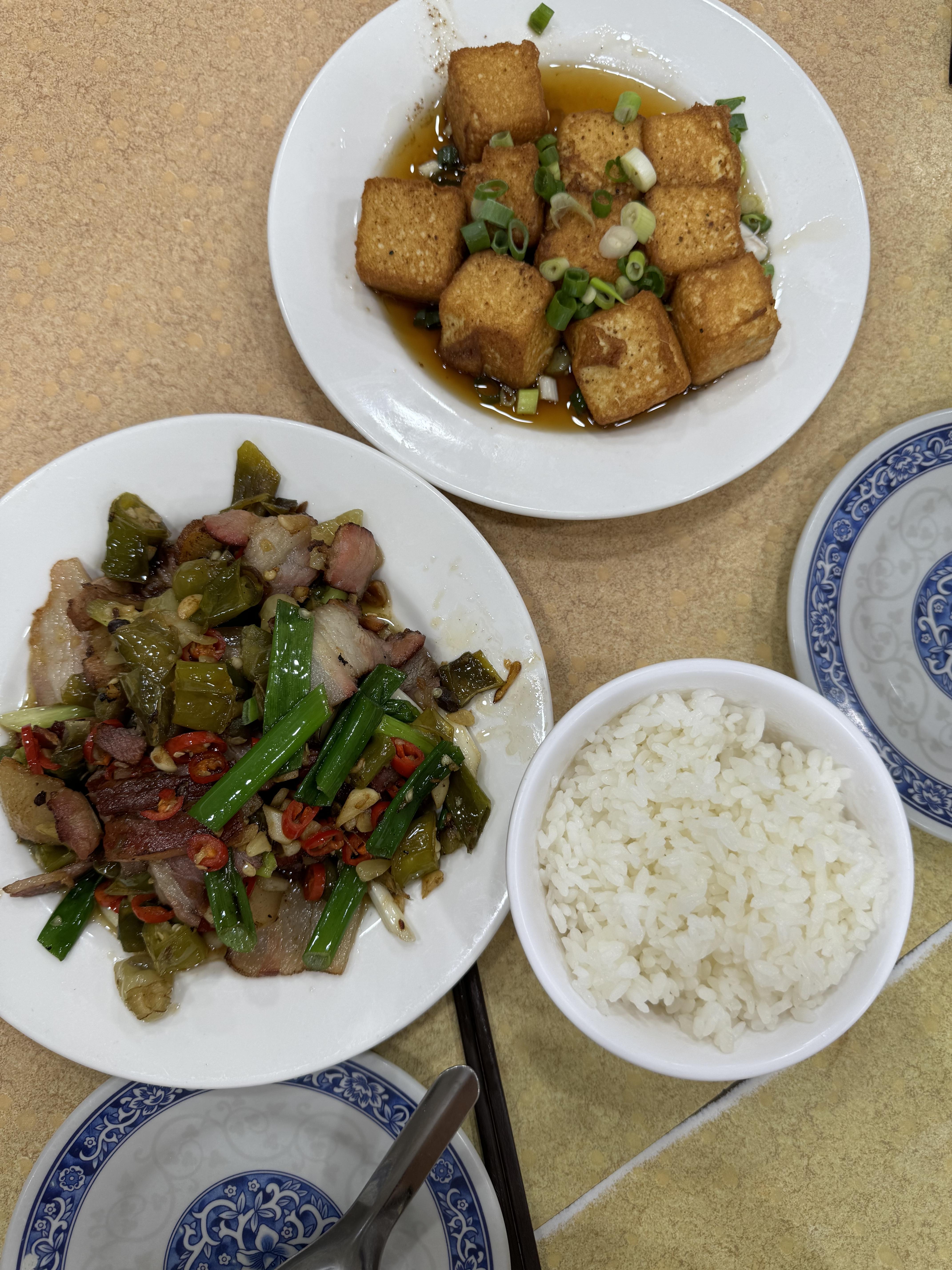 흰쌀밥, 돼지고기 고추 볶음(?), 계란두부튀김, 부추볶음 이렇게 세 개만 시켜봤다. 내 생각엔 여기서 흰쌀밥은 진짜 필수인 듯하다. 저 돼지고기 볶음은 그냥 먹을 때랑 흰쌀밥이랑 같이 먹을 때랑 맛이 아예 다르게 느껴질 정도로 흰쌀밥과 합이 너무 좋다. 계란 두부 튀김도 처음 먹어봐서 그런지 진~짜 맛있었다.