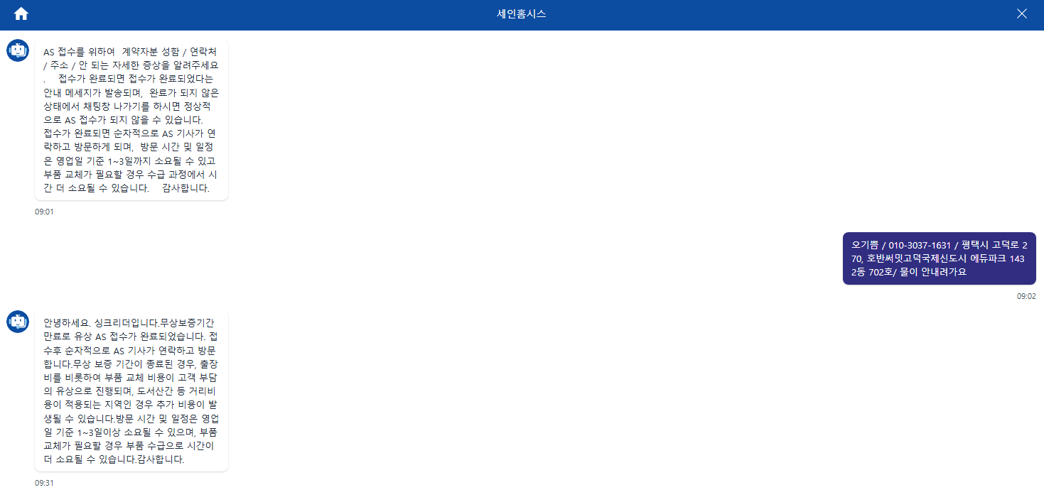 아침에 여러차례 전화해봤는데 전화 연결이 아예 안되고, 홈페이지에 나와있는 챗봇으로 AS 접수를 했다.