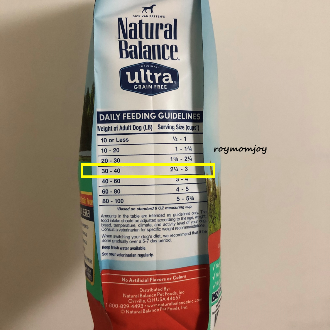 많은 분들이 하루 총 급여사료량 그리고 한번 줄 때 급여 해야하는 사료량이 헷갈리실 것 같아요. 사료봉투 옆부분에 급여량을 체중별로 설명해 주고 있었습니다. 로이를 기준으로 하자면 약 15-16kg 정도 됩니다. 대략 35파운드가 되더라구요. 35파운드는 하루 급여량이 약 3컵 정도로 급여 하라고 되어있습니다. 그리고 1컵은 8oz 기준이라고 되어있네요. 그렇다면 하루에 약 24oz에 해당하고 대략 680g이라고 생각하시면 되겠습니다.