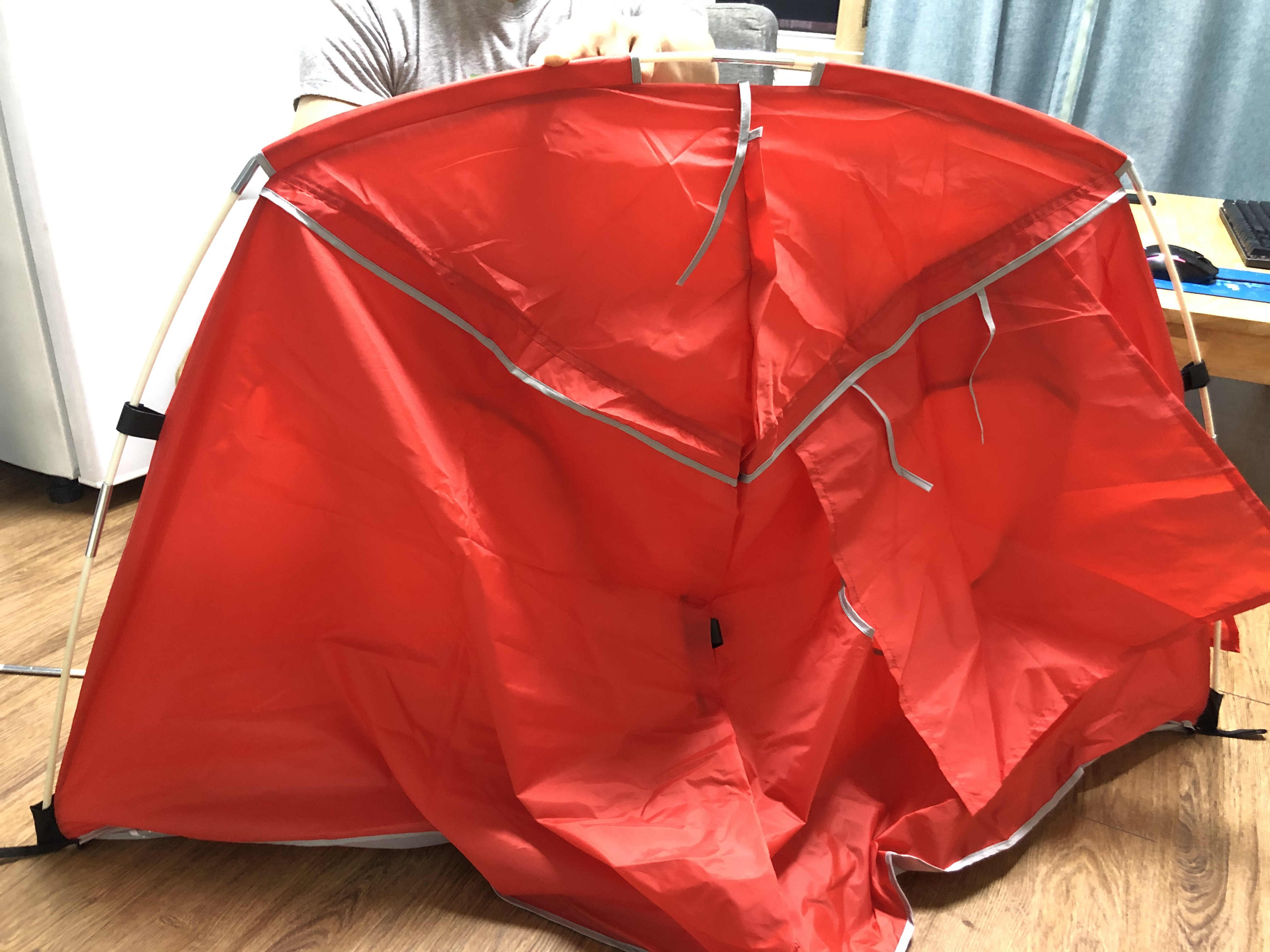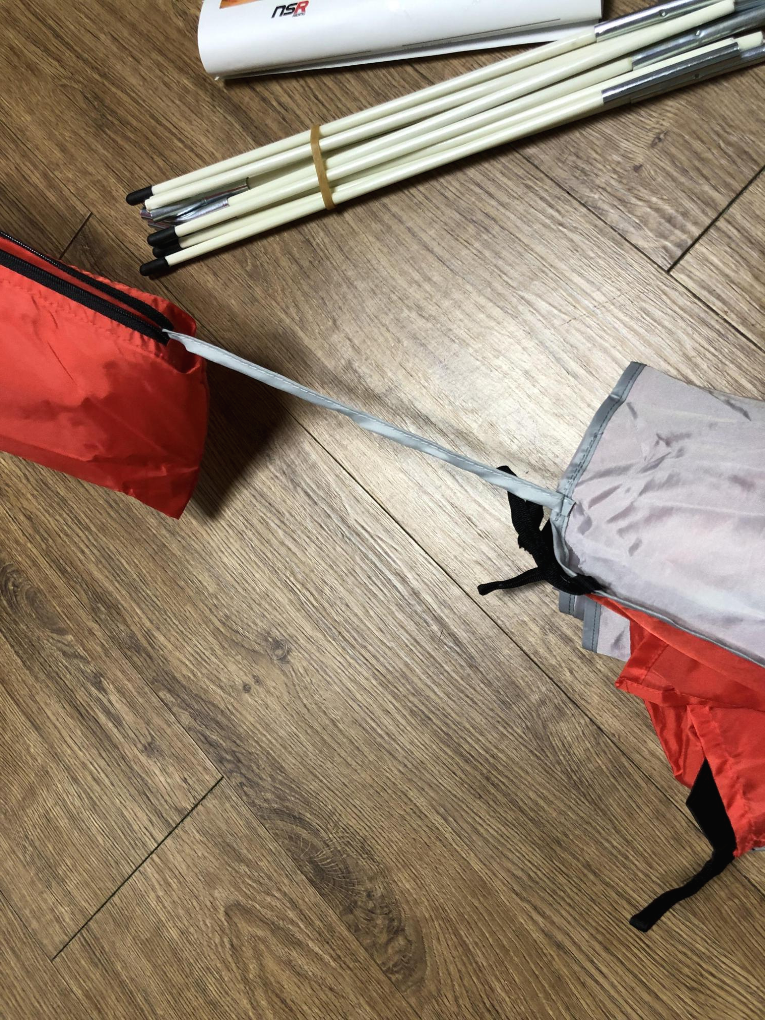 본격적으로 텐트를 조립해 봅니다. 일반 텐트와 동일하게 접혀져 있던 폴대를 일자로 쭉 펴주고, 텐트의 구멍에 맞게 폴대를 끼워줍니다.